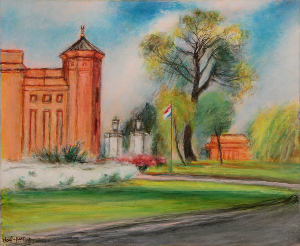 畑画伯は、1978(昭和53)のインド旅行以後、たびたびインド及びパキスタンやネパールを訪れているが、1990年12月にはインド西北部のラジャスタンへ取材旅行を行っている。この絵の副題になっているジョードプルはラジャスタン第2の都市で、旧市街の家屋の壁が青く塗られていることから、通称「ブルーシティー」と呼ばれ、また、一年中太陽が当たっている明るい都市なので「Sun City」とも呼ばれている。この作品は、画伯がインドのジョードプルを訪れた際に滞留したホテルの風景を題材にしたものと思われる。