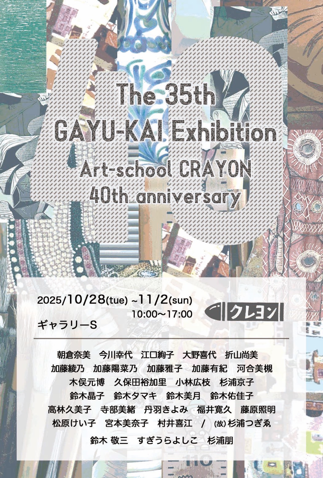 同窓生からの情報 アートスクールクレヨン感謝の40周年! アートスクールクレヨン感謝の40周年!第35回 画遊会展アートスクールクレヨン一般生徒作品展2025のお知らせ 日時 10/28(tue) ~11/2(sun)10:00~17:00会場豊橋市向山東町4-2 ギャラリーS 杉浦京子 (16回生)鈴木タマキ(20回生)鈴木 敬三 (30回生)藤原照明 (元校長)