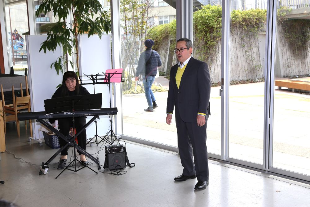 一曲目はプッチーニのオペラ『蝶々夫人』より「ある晴れた日に」を39回生の宮川むつみさんに、二曲目は同じく『蝶々夫人』より「さらば愛の家」をゲストの国際的オペラ歌手岡田尚之さんに、安田訓子さんの伴奏で、最高レベルの素晴らしいアリアを披露していただきました。