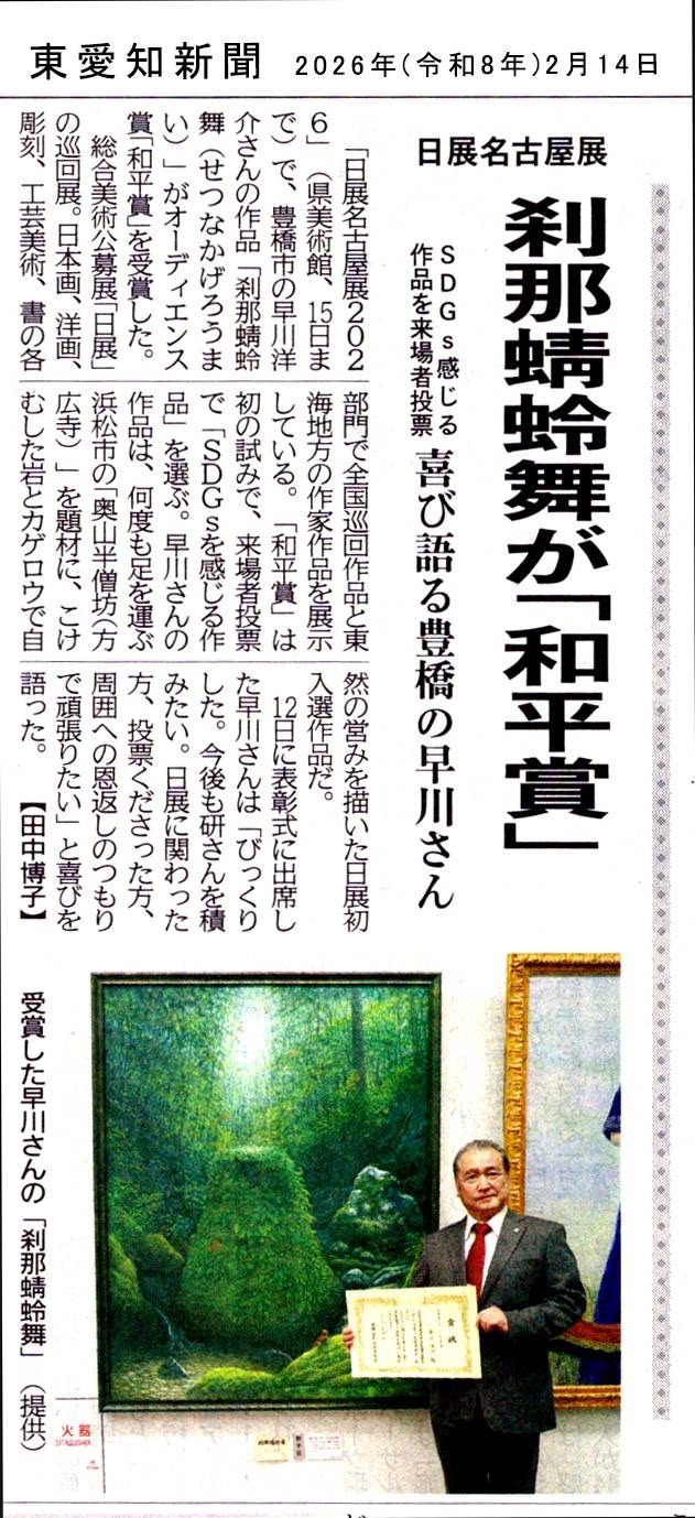 同窓生からの情報 刹那蜻蛉舞が「和平賞」 日展名古屋展刹那蜻蛉舞「和平賞」のお知らせ早川 洋介(29回生) 2025年 日本美術展覧会「第118回 日展」第二科洋画にて入選された「刹那蜻蛉舞(せつなかげろうまい)」が更に「和平賞」受賞
